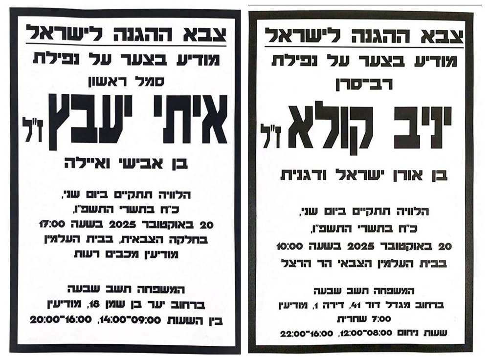 הלוויותיהם של שני הלוחמים ממודיעין שנהרגו אתמול בעזה, ייערכו היום, שני, כ"ח בתשרי תשפ"ו, 20.10.25, והם יובאו למנוחות.